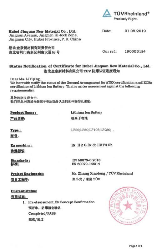 2019年8月1日,金泉能源磷酸鐵鋰電池LF80/105/280完美通過德國萊茵TüV ATEX防爆認(rèn)證,標(biāo)志著金泉能源產(chǎn)品技術(shù)水平和產(chǎn)品安全性能達(dá)到了更高的水平!