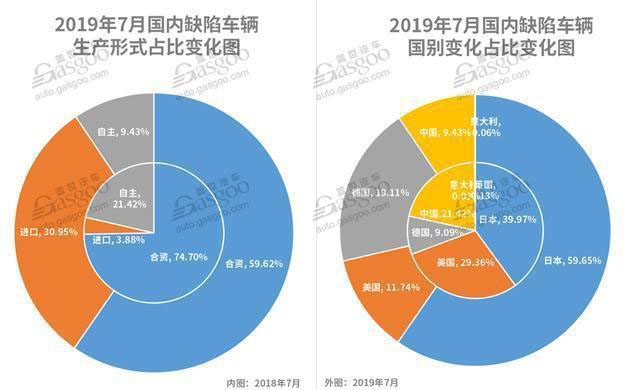 整體來(lái)看,隨著時(shí)間進(jìn)入2019年,各超豪華品牌車(chē)型的扎堆召回,國(guó)內(nèi)汽車(chē)召回中,進(jìn)口車(chē)輛占比較去年同期逐漸增加,時(shí)至7月,進(jìn)口車(chē)型占召回總量的30.95%,較去年同期占比增加了27.07%。與之對(duì)應(yīng)的則是自主品牌、合資品牌占比的大幅縮小,這其中合資品牌59.62%的占比則主要來(lái)源于日系“雙田”的貢獻(xiàn)。