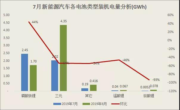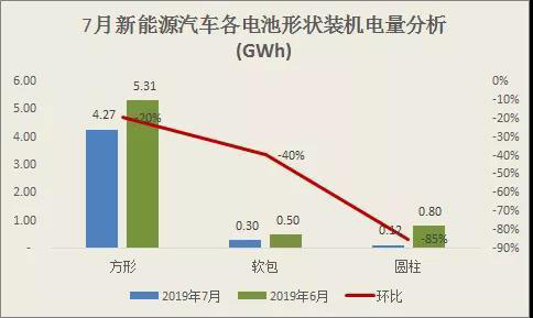 高工產(chǎn)業(yè)研究院(GGII)通過最新發(fā)布的《動力電池月度數(shù)據(jù)庫》統(tǒng)計顯示,2019年7月我國新能源汽車生產(chǎn)約7.4萬輛,同比下降6%,環(huán)比下降43%;動力電池裝機總電量約4.70GWh,同比增長40%,環(huán)比下降29%。