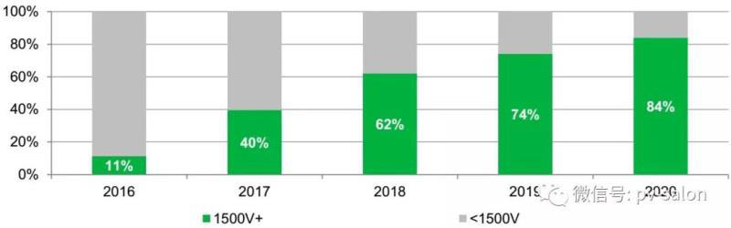 作為降本增效的核心手段, 1500V浪潮已席卷全球。據IHS報告統計,1500V系統應用逐年遞增,除中國以外,全球預計2019年1500V系統占比74%,2020年將達到84%。美國、歐洲、印度、越南等光伏裝機大國1500V的比例更高。例如,陽光電源今年上半年在越南發(fā)貨量達到了1.4GW,其中90%都是1500V。