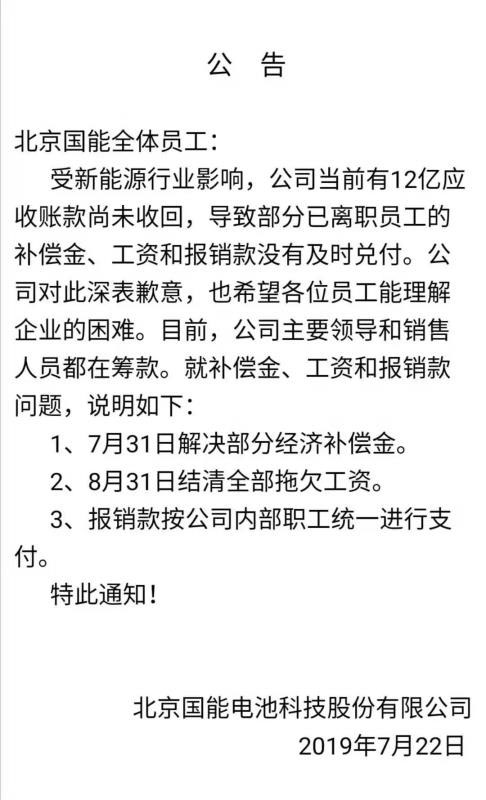 今年5月,北京國能電池科技有限公司(以下簡稱“國能電池”)被曝因資金問題即將倒閉、破產(chǎn)清算。為此,國能電池專門發(fā)布澄清公告,表示經(jīng)營正常。隨后在7月22日,國能電池承認(rèn)欠薪,在公告中稱12億元應(yīng)收賬款尚未收回,導(dǎo)致拖欠員工薪資。