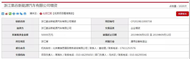 8月13日,北京產(chǎn)權(quán)交易所網(wǎng)站消息顯示,浙江氫谷新能源汽車(chē)有限公司(下稱“浙江氫谷”)增資項(xiàng)目在北京產(chǎn)權(quán)交易所正式掛牌。該項(xiàng)目擬募集資金5億元,擬征集投資方1至2個(gè),新進(jìn)股東合計(jì)持股比例不高于10%,所募集資金將主要用于氫燃料電池生產(chǎn)線設(shè)備、研發(fā)費(fèi)用、訂單完成所需流動(dòng)資金。