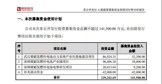 據(jù)公告顯示,在扣除發(fā)行費(fèi)用后將全部用于以下4個方面:(1)武漢雄韜氫燃料電池動力系統(tǒng)產(chǎn)業(yè)化基地建設(shè)項目;(2)深圳雄韜氫燃料電池產(chǎn)業(yè)園項目;(3)深圳雄韜氫燃料電池電堆研發(fā)項目;(4)補(bǔ)充流動資金。