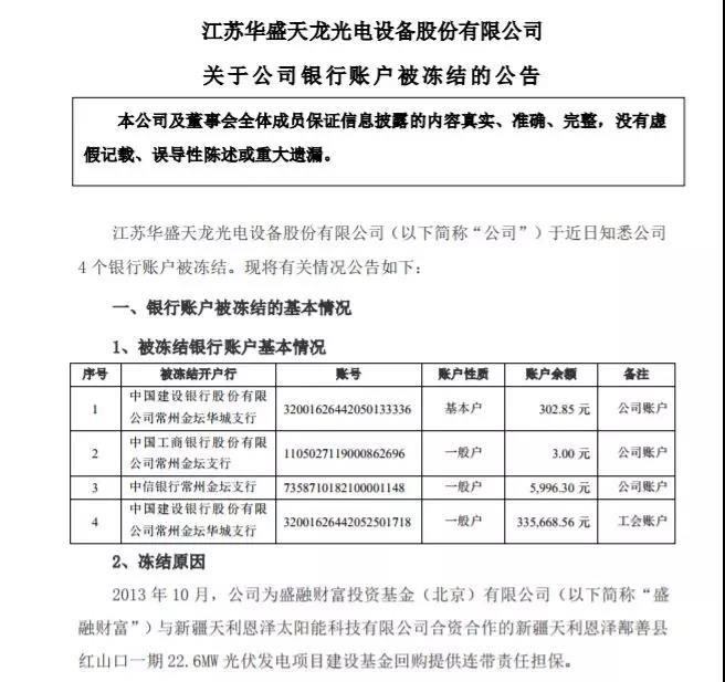 同日,天龍光電因未能償還此前新疆天利恩澤鄯善縣紅山口一期22.6MW光伏發(fā)電項目投資人的相關款項,3個公司賬戶和1個工會賬戶被凍結,賬戶余額累計超過30萬元。