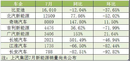 受大環(huán)境影響,新能源汽車(chē)生產(chǎn)企業(yè)7月銷(xiāo)量也環(huán)比大幅下降。高工電動(dòng)車(chē)統(tǒng)計(jì)的8家已經(jīng)披露了產(chǎn)銷(xiāo)快報(bào)的企業(yè)中,除廣汽新能源、奇瑞兩家企業(yè)6月基數(shù)較小外,其余環(huán)比均出現(xiàn)了較大幅度的下滑。
