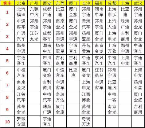 客車企業(yè)數(shù)量眾多,主力企業(yè)參與并非很強,。吉利商用車表現(xiàn)突出,鄭州宇通、中通、北汽福田、比亞迪、東莞中汽宏遠和南京金龍等表現(xiàn)較強等表現(xiàn)突出。