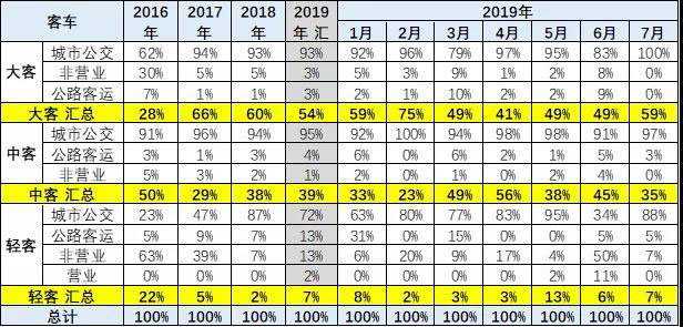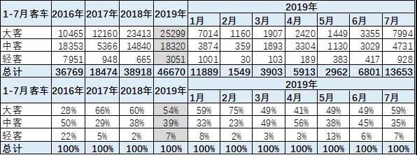 歷年1-7月客車占比僅有全年的20%左右,雖然18年上半年占比高,但19年占比18年全年銷量預計達到50%左右,目前看19年改善較大,市場潛力仍有待釋放。