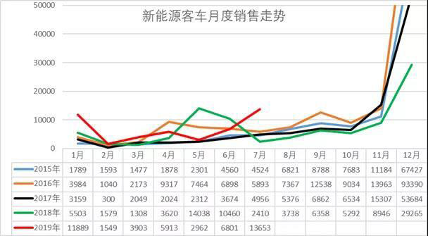 19年1-7月銷量增速20%的表現(xiàn)較好,但5月銷量2962臺的同比下降較多, 7月達到13653臺的新能源客車表現(xiàn)相對較強。未來仍看補貼的年末退出效應。