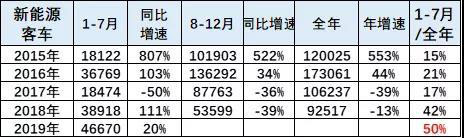2019年新能源車增長總體很強,其中乘用車增長突出,新能源客車19年1-7月4.66萬臺,同比增長20%,增長表現(xiàn)平穩(wěn),。19年1-7月客車的表現(xiàn)較強。