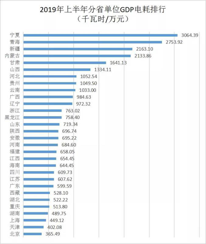上半年,我國單位GDP電耗為753.55千瓦時(shí)/萬元。各省每萬元單位GDP的電力消耗情況又如何呢?再看下圖排行。