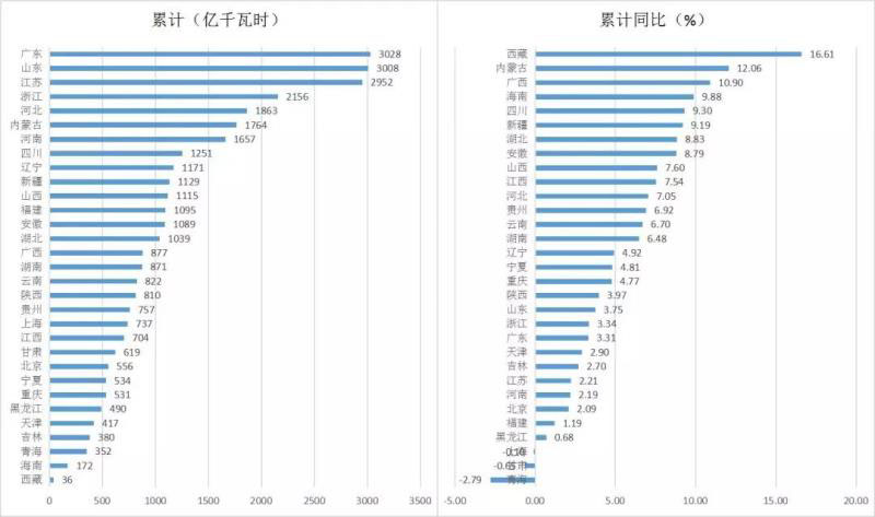 2019年上半年全國分省全社會(huì)用電量及增速如上兩圖所示:從累計(jì)用電量來看,廣東省以3028億千瓦時(shí)排第一,從全年累計(jì)用電增速來看,西藏以16.61%排第一。