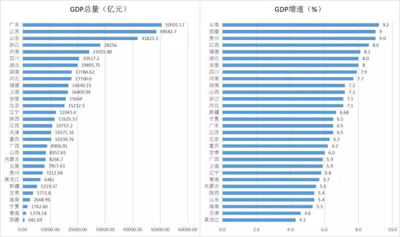 2019年上半年全國分省GDP總量及增速如上兩圖所示:從GDP總量來看,廣東最高,達(dá)50501.17億元,西藏墊底,為681.69億元;從GDP增速來看,云南9.2%,名列第一,黑龍江墊底,增速只有4.3%。