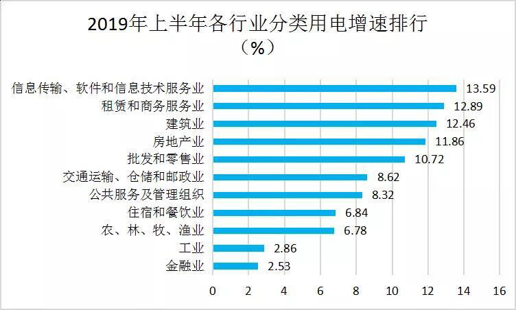 由上圖可見,2019年上半年全國信息傳輸、軟件和信息技術(shù)服務(wù)業(yè)的用電增速最高,而金融業(yè)用電增速最低。