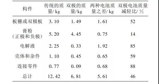 通過(guò)采用雙極性結(jié)構(gòu),大大減輕了鉛酸電池的質(zhì)量,提高了設(shè)計(jì)效率。如表1,是對(duì)傳統(tǒng)的12V12Ah鉛酸電池與雙極性24V12Ah鉛酸電池零件分解質(zhì)量的比較。