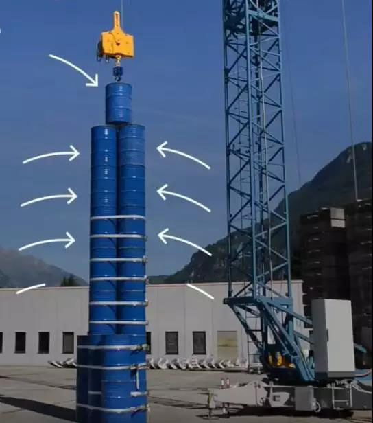 這項技術(shù)對塔吊的精度要求非常高。幾十米長、迎風(fēng)飄擺的纜繩,需要做到讓 5000 塊磚,每一塊的位置誤差都小于幾毫米。否則,百米高塔就真的會像小孩子搭的積木一樣,說塌就塌。在知名媒體 Quartz 發(fā)布的一段 Energy Vault 原型機(jī)的視頻中,鋼纜的抖動幅度明顯很大,遠(yuǎn)不止幾毫米。而且,只有 20 米高的塔,為了提高穩(wěn)定性,Energy Vault 把塔的主體用一道道鋼箍緊緊綁牢。可能他們自己也擔(dān)心,如果上面的沒放穩(wěn),下面的就會塌。