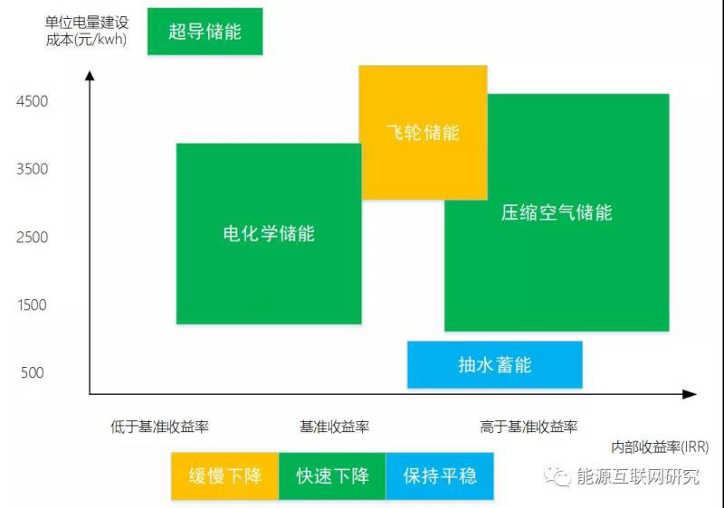 但電化學(xué)儲能和超導(dǎo)儲能成本都處于快速下降趨勢。其中電化學(xué)儲能近期成本下降較快。隨著電池成本下降速度加快,內(nèi)部收益率(IRR)將逐漸增加,經(jīng)濟(jì)性趨好。當(dāng)電池成本下降速度足夠大時,電化學(xué)儲能項(xiàng)目有望超過基準(zhǔn)收益率,從電力系統(tǒng)整體收益來看,其財務(wù)逐步具備可行性。