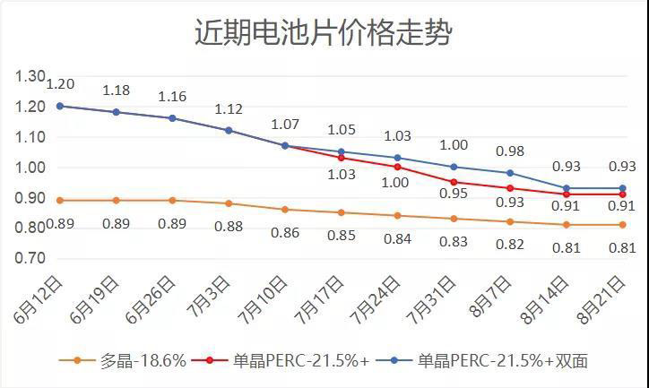 到了二季度末,在國(guó)內(nèi)的630小幅搶裝結(jié)束,下半年競(jìng)價(jià)項(xiàng)目還未啟動(dòng)的現(xiàn)狀下,加上適逢歐洲市場(chǎng)夏季假期,需求的階段性下滑加上單晶PERC電池產(chǎn)能的陸續(xù)釋放,開(kāi)啟了這一輪PERC電池片的跌價(jià)。