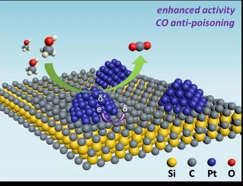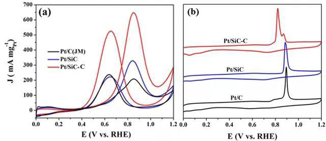 近日,中國(guó)科學(xué)院山西煤炭化學(xué)研究所童希立科研團(tuán)隊(duì)在長(zhǎng)期碳化硅研究基礎(chǔ)上,發(fā)現(xiàn)通過(guò)納米碳化硅載體支持,可以明顯減少Pt的使用量并保持活性(是商用Pt/C催化劑3倍以上),同時(shí)提高了其抗CO中毒能力(圖1)。