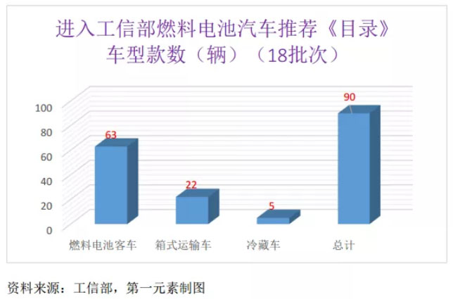 小編整理了近18批次工信部發(fā)布的《新能源汽車推廣應(yīng)用推薦車型目錄》,只篩選出氫燃料電池汽車方面的數(shù)據(jù)。在2019年1~5批次至2018年1~13批次的《推薦目錄》中,氫燃料電池汽車共計(jì)入選90款車型,其中燃料電池客車入選63款,占比為70%;箱式運(yùn)輸車是入選車型第二多的車型,入選22款,占比為24.4%;最后是冷藏車,入選車型只有5輛,占比5.6%。