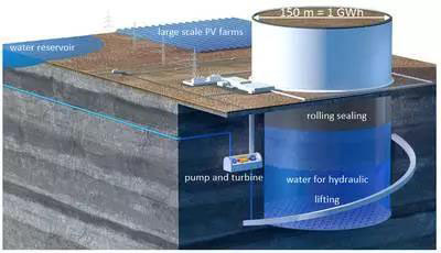 其原理如圖所示:用圓柱體的巖石(像一個活塞一樣)嵌放在形狀相同的儲水池中,有富余電力時(例白天有光伏發(fā)電時),泵會把水壓入儲水池中,此時巖石活塞就會被水壓提起,即電能轉(zhuǎn)化成了重力勢能。而當電網(wǎng)需要電能供應時(例晚上無光伏發(fā)電時),閘門會打開,此時巖石活塞會下降,擠壓儲水池中的水流經(jīng)泵來發(fā)電,此時重力勢能會轉(zhuǎn)化成電能。