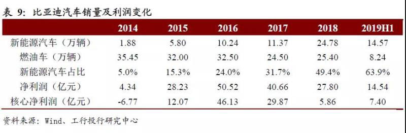 無獨(dú)有偶,作為國(guó)內(nèi)新能源汽車銷量冠軍比亞迪近年來雖然業(yè)務(wù)發(fā)展迅速,但卻同樣面臨盈利的困境。2019上半年比亞迪新能源汽車銷量高達(dá)14.57萬輛(乘用車14.076萬輛),國(guó)內(nèi)位居第一,全球僅次于特斯拉位居第二,新能源汽車占比高達(dá)63.9%,比亞迪整車產(chǎn)業(yè)實(shí)現(xiàn)了向電動(dòng)化的轉(zhuǎn)型,但我們看到的是比亞迪近年來的凈利潤(rùn)卻在2016年后持續(xù)下降。