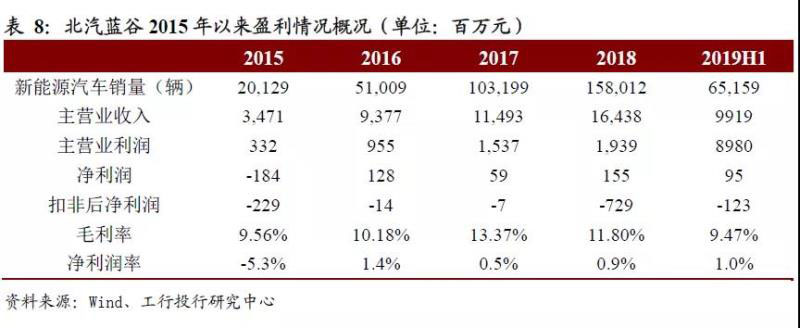 我們以國(guó)內(nèi)新能源汽車標(biāo)竿企業(yè)之一的北汽藍(lán)谷為例,該公司常年銷量?jī)H次于比亞迪位居國(guó)內(nèi)第二,也是國(guó)內(nèi)唯一一家以新能源汽車整車為核心業(yè)務(wù)的上市公司。盡管近年來公司新能源汽車銷量一路高歌猛進(jìn),但公司盈利能力卻并未得到相應(yīng)提升,2018年北汽藍(lán)谷雖然實(shí)現(xiàn)了高達(dá)15.8萬輛的銷量,但其凈利潤(rùn)僅有1.55億元,扣除非經(jīng)常性損益后甚至還虧損7.29億元,公司毛利率近年來基本維持在10%左右的低水平,凈利潤(rùn)率多數(shù)年份不足1%,而且在2015年以來的五個(gè)年度年中,北汽藍(lán)谷沒有一年的核心凈利潤(rùn)為正值。