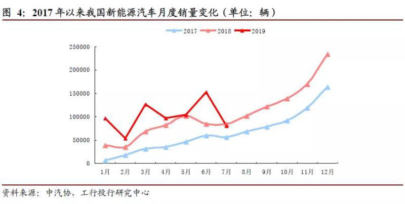 在這樣的背景下,我們看到2019年6、7月份國(guó)內(nèi)新能源汽車銷量出現(xiàn)異常波動(dòng),其中6月份新能源汽車銷量達(dá)到年內(nèi)峰值為15.2萬輛,但7月份則暴跌至8萬輛。如果沒有進(jìn)一步的刺激政策出臺(tái),我們認(rèn)為2019下半年國(guó)內(nèi)新能源汽車市場(chǎng)難言樂觀。