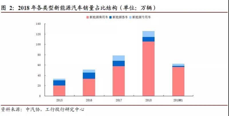 從新能源汽車的產(chǎn)業(yè)結(jié)構(gòu)看,乘用車已成為絕對(duì)主力。根據(jù)2019上半年的數(shù)據(jù)顯示,新能源乘用車銷量為56.3萬輛,占到新能源汽車總銷量的91.2%,而新能源客車、新能源專用車(物流、環(huán)衛(wèi)、載貨)銷量分別僅有2.1萬輛和3.3萬輛,占比分別僅有3.4%和5.3%,可以看出新能源乘用車已經(jīng)成為新能源汽車的主導(dǎo)力量。而在2017年和2018年國(guó)內(nèi)新能源乘用車的占比還分別僅為74.5%和83.8%,導(dǎo)致新能源乘用車占比持續(xù)上升的主要原因在于新能源客車和專用車市場(chǎng)空間有限而且完全依賴政策驅(qū)動(dòng),如目前的新能源客車市場(chǎng)需求主要來自于公交替換,每年需求量基本穩(wěn)定在10萬輛左右,需求已遭遇天花板,專用車由于成本原因推廣阻力也較大,而乘用車市場(chǎng)一方面需求總量較大,二是政策驅(qū)動(dòng)效果明顯,因此成為引領(lǐng)新能源汽車增長(zhǎng)的關(guān)鍵。從未來發(fā)展前景來看,新能源乘用車也是最具增長(zhǎng)潛力的市場(chǎng),到2020年我國(guó)政府的目標(biāo)是希望新能源汽車銷量可以達(dá)到200萬輛,新增的需求量將幾乎全部來自于乘用車市場(chǎng)。