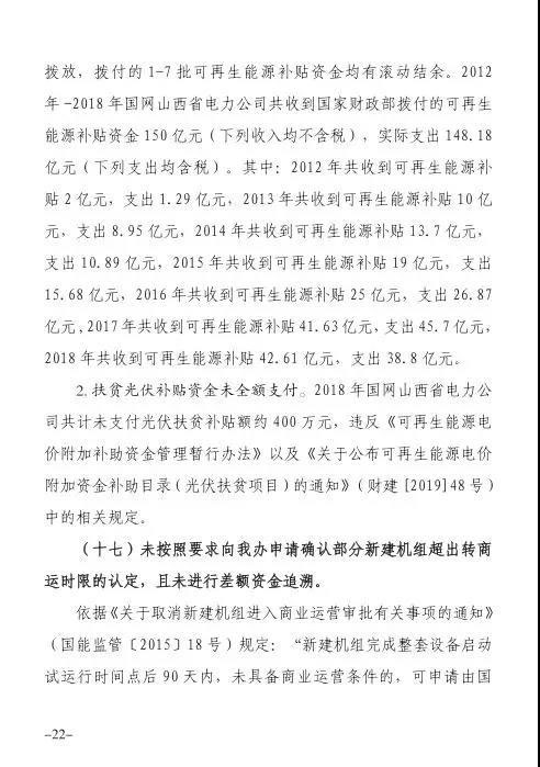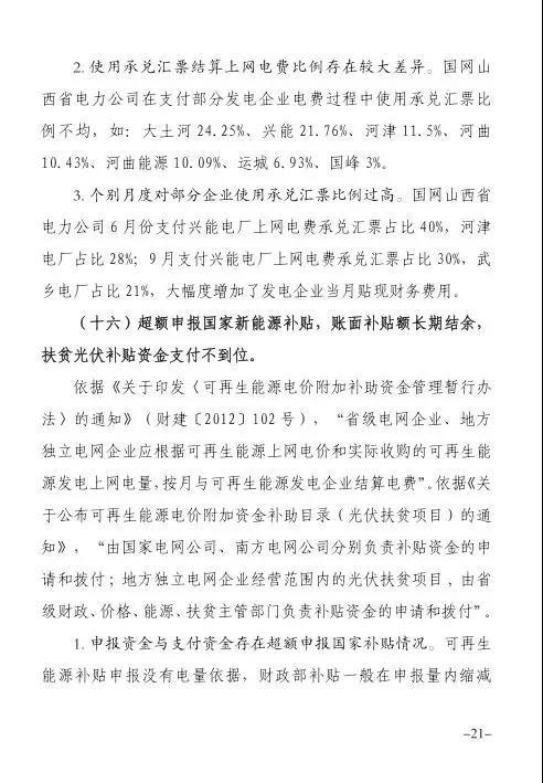 日前,山西省能源監(jiān)管辦發(fā)布《2018-2019年度山西電力調(diào)度交易秩序監(jiān)管報(bào)告》,報(bào)告指出,超額申報(bào)國(guó)家新能源補(bǔ)貼,賬面補(bǔ)貼額長(zhǎng)期結(jié)余,扶貧光伏補(bǔ)貼資金支付不到位。2012-2018共收到可再生能源補(bǔ)貼資金150億元(不含稅),實(shí)際支出148.18億元(含稅);未支付光伏扶貧補(bǔ)貼金額約400萬(wàn)元。