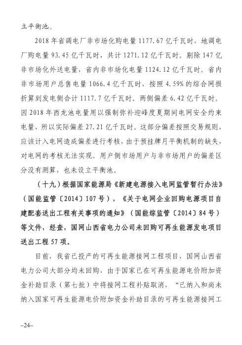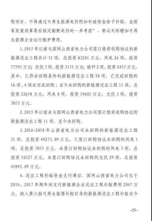 同時(shí),據(jù)國(guó)家能源局《新建電源接入電網(wǎng)監(jiān)管暫行辦法》(國(guó)能監(jiān)管<2014>107號(hào)),《關(guān)于電網(wǎng)企業(yè)回購(gòu)電源項(xiàng)目自建配套送出工程有關(guān)事項(xiàng)的通知》(國(guó)能監(jiān)管<2014>84號(hào))等文件,經(jīng)查,國(guó)網(wǎng)山西省電力公司未回購(gòu)可再生能源發(fā)電項(xiàng)目送出工程57項(xiàng)。其中,至今未簽訂回購(gòu)協(xié)議未回購(gòu)的風(fēng)電工程12項(xiàng),總投資3.32億元,光伏工程32項(xiàng),總投資4.89億元。