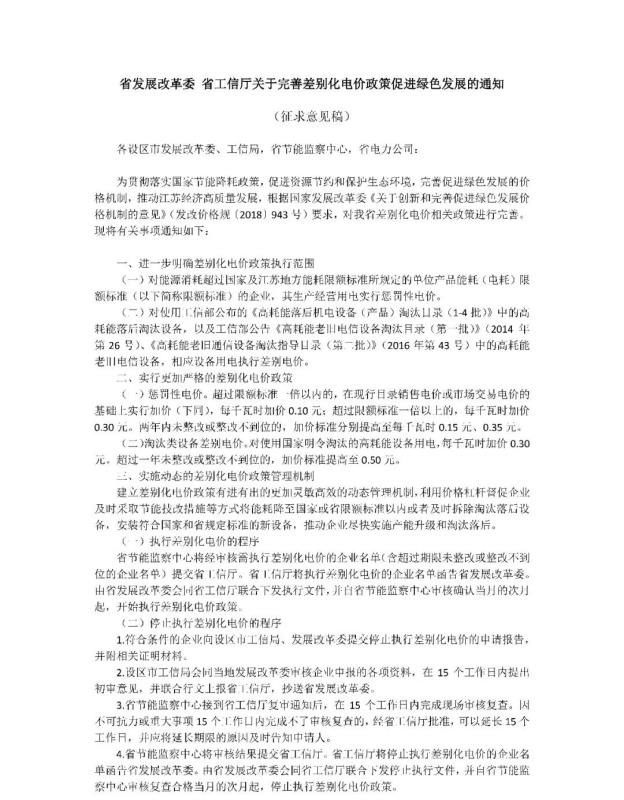 近日,江蘇省發(fā)展改革委、工信廳聯(lián)合發(fā)布《關(guān)于完善差別化電價政策促進綠色發(fā)展的通知(征求意見稿)》(以下簡稱《意見稿》),對能源消耗超過國家及江蘇地方能耗限額標準所規(guī)定的單位產(chǎn)品能耗(電耗)限額標準的企業(yè),實行生產(chǎn)經(jīng)營用電懲罰性電價。