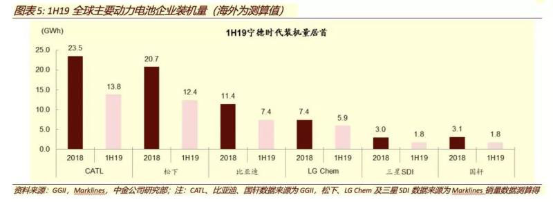 來(lái)自高工產(chǎn)業(yè)研究院(GGII)和中金公司的數(shù)據(jù)顯示,2019年上半年,全球裝機(jī)量排名中,寧德時(shí)代、松下、比亞迪、LG化學(xué)、三星SDI位列前五位,裝機(jī)量分別為13.8GWh、12.4GWh、7.4GWh、5.9GWh、1.8GWh。
