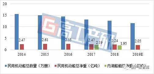 2014-2019年中國(guó)民用機(jī)動(dòng)船舶數(shù)量與噸位