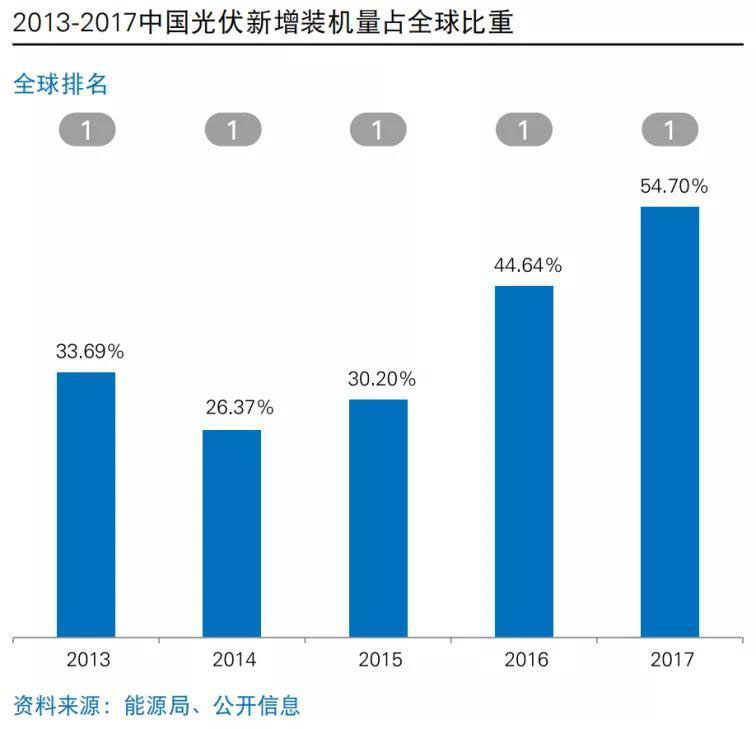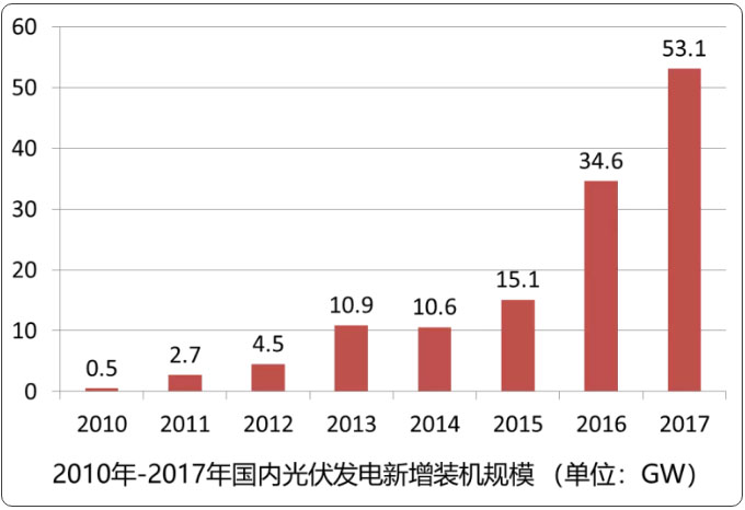 中國光伏電站市場的正式啟動,是從2010年的“金太陽工程”開始的,但真正爆發(fā)是2013年光伏標桿電價補貼政策出臺后,中國光伏發(fā)電一躍位居世界首位,持續(xù)至今。2017年新增裝機甚至達到了全球的54.7%。就算去年531新政下“光伏寒冬”,仍然達到了40%。