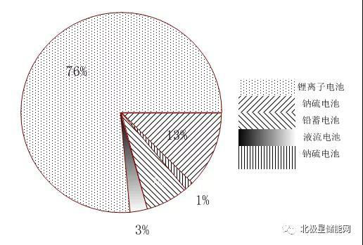 步入“十三五”后,電化學儲能技術作為儲能產(chǎn)業(yè)的潛力股率先進入發(fā)展快車道,儲能產(chǎn)業(yè)步入由示范應用轉(zhuǎn)向為商業(yè)化的過渡期[10]。根據(jù)中關村儲能產(chǎn)業(yè)技術聯(lián)盟(CNESA)數(shù)據(jù),截止到2017年底,全球投運的電化學儲能項目總裝機近3000MW,占已投運儲能總規(guī)模的1.7%,較上一年的電化學儲能累計裝機規(guī)模增長了45%[11]。其中鋰離子電池的累計裝機規(guī)模最大,為2213MW,占比76%,鈉硫電池、鉛蓄電池、液流電池、超級電容等分別占全球電化學儲能總裝機13%、7%、3%、0.002%(見圖1)。由此可見,目前鋰離子電池行業(yè)是電儲能應用領域最具潛力。