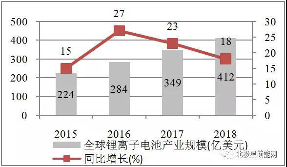 據(jù)統(tǒng)計[12],2018年全球鋰離子電池產(chǎn)業(yè)規(guī)模首次突破400億美元,達到412億美元,同比增長18%,較2017年下降5個百分點(見圖2)。由此可見,在儲能政策支撐下,鋰電池市場仍將會保持快速發(fā)展勢頭。