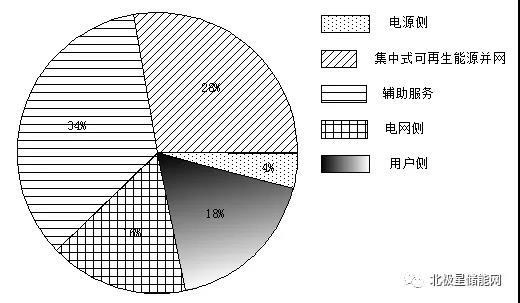 目前,儲能在我國電力市場有5個應用領域:電源側(cè)、集中式可再生能源并網(wǎng)、輔助服務、電網(wǎng)側(cè)、用戶側(cè)[14, 15]。根據(jù)CNESA的數(shù)據(jù),截止2017年底全球電化學儲能項目在電源側(cè)、集中式可再生能源并網(wǎng)、輔助服務、電網(wǎng)側(cè)、用戶側(cè)的占比分別為4%、28%、34%、16%和18%(見圖3),其中可再生能源并網(wǎng)的累計裝機規(guī)模達到820.8MW,占全球累計投運電化學儲能規(guī)模的28%,與2016年相比增幅達36.6%。目前,集中可再生能源并網(wǎng)項目已經(jīng)初具規(guī)模,輔助服務和電網(wǎng)側(cè)項目也迎來新的發(fā)展。