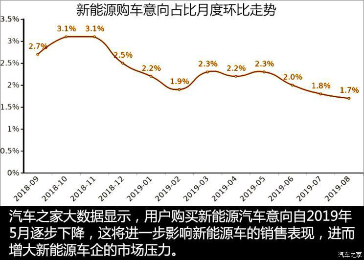其次,汽車之家大數(shù)據(jù)顯示,2019年8月,乘用車中新能源車用戶購車意向占比為1.7%,較7月小幅下跌0.1個(gè)百分點(diǎn);且從圖表看,2019年5-8月,用戶購買新能源汽車的意向占比呈不斷下行態(tài)勢,這意味著新能源車企如果不能采取有效措施,經(jīng)過近幾年努力擴(kuò)大的新能源市場將再次被燃油車搶占,被動(dòng)壓縮自身生存空間。