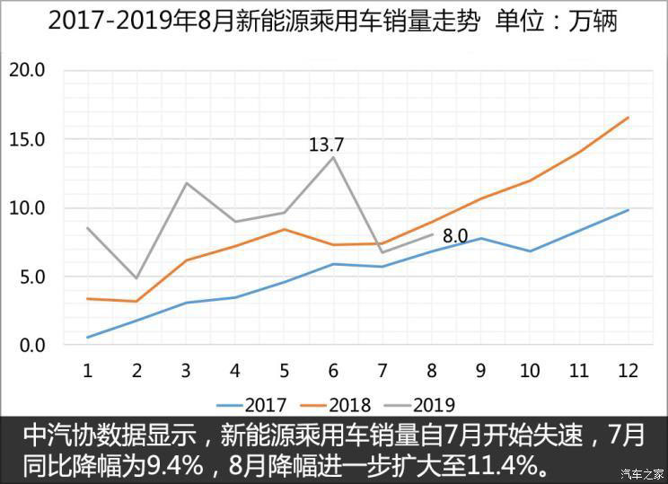 首先,中汽協(xié)最新數(shù)據(jù)顯示,8月汽車銷售195.8萬輛同比下滑6.9%;新能源汽車也未能幸免,不僅產(chǎn)銷雙降,且銷量降幅相比7月進(jìn)一步擴(kuò)大至15.8%,而這已經(jīng)是新能源汽車連續(xù)第二個(gè)月出現(xiàn)同比下跌的情況。政策紅利扶持下的新能源汽車,在高速增長路上狂奔五年之后,在第六個(gè)年頭的6月25日補(bǔ)貼退坡后開始退燒。