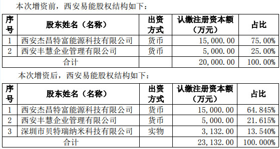 9月12日,貝特瑞發(fā)布公告稱,為了布局儲(chǔ)能市場(chǎng),子公司深圳市貝特瑞納米科技有限公司擬利用110MWH電池資產(chǎn)作價(jià)8800萬元(含稅)投資入股西安易能智慧科技有限公司,投后持股占比 13.54%,同時(shí)將向西安易能派駐一名董事。由于公司持股比例較低,西安易能的日常經(jīng)營(yíng)管理不由本公司主導(dǎo)。本次增資前后,西安易能股權(quán)結(jié)構(gòu)如下: