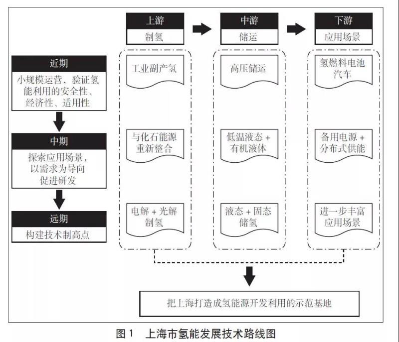 中期隨著市場(chǎng)規(guī)模的擴(kuò)大,結(jié)合化石能源重整技術(shù)的使用和液態(tài)儲(chǔ)氫技術(shù)的完善,實(shí)現(xiàn)向儲(chǔ)能和分布式能源應(yīng)用領(lǐng)域的拓展;遠(yuǎn)期隨著應(yīng)用領(lǐng)域的進(jìn)一步拓展,上海市可在氫能利用的全產(chǎn)業(yè)鏈上構(gòu)建技術(shù)制高點(diǎn)(見(jiàn)圖1)。