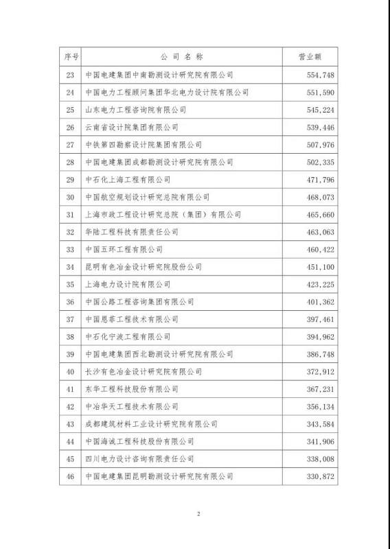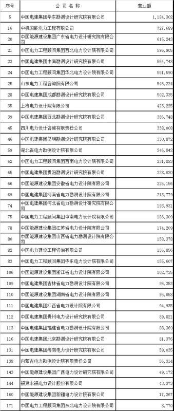 根據(jù)相關(guān)數(shù)據(jù),對電力設(shè)計院排名進行了摘錄,表中營業(yè)額為企業(yè)2018年1月1日至2018年12月31日境內(nèi)外工程總承包營業(yè)額,序號為原表的全行業(yè)累加排序,僅供參考。詳情如下: