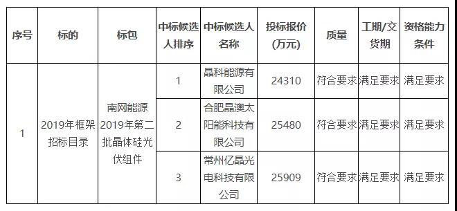 近日,南網能源發(fā)布2019年第二批晶體硅光伏組件結果公示,晶科、晶澳、常州億晶分別以24310萬、25480萬、25909萬成為中標候選人,均價分別為1.87元/W、1.96元/W、1.99元/W。