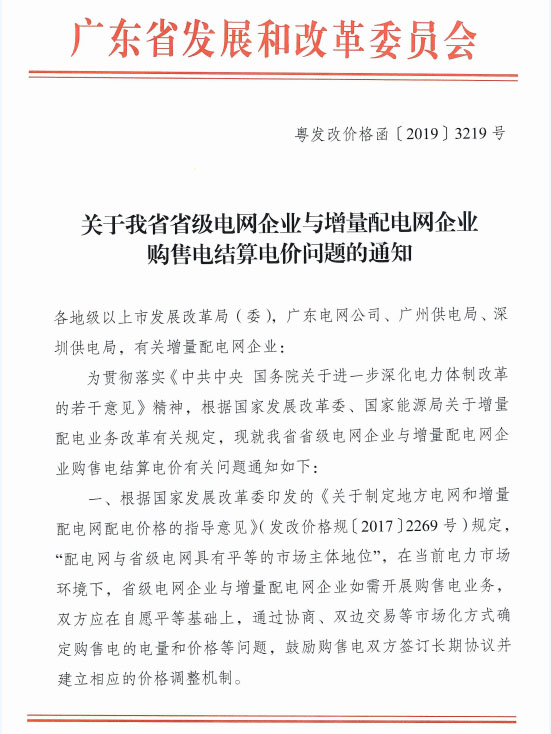 近日廣東省發(fā)改委發(fā)布《關(guān)于我省省級電網(wǎng)企業(yè)與增量配電網(wǎng)企業(yè)購售電結(jié)算電價(jià)問題的通知》,通知中稱開展購售電業(yè)務(wù)的雙方應(yīng)在自愿平等的基礎(chǔ)上通過協(xié)商、雙邊交易等市場化方式確定購售電電量和電價(jià),鼓勵(lì)購售電雙方簽訂長期協(xié)議并建立相應(yīng)的價(jià)格調(diào)整機(jī)制。詳情如下: