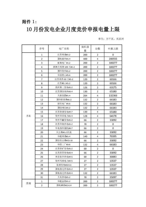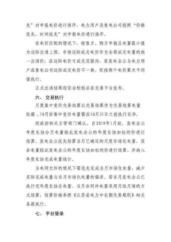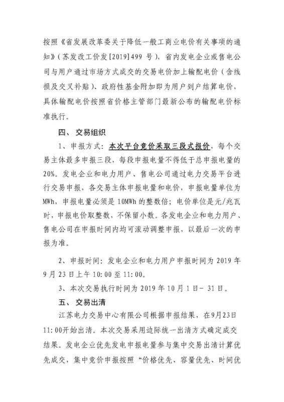2019年10月份江蘇省電力集中競價交易公告