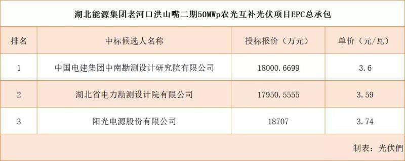 中國電建集團中南勘測設(shè)計研究院有限公司以單價3.6元/瓦位列《湖北能源集團老河口洪山嘴二期50MWp農(nóng)光互補光伏項目EPC總承包》第一中標(biāo)候選人、詳情如下: