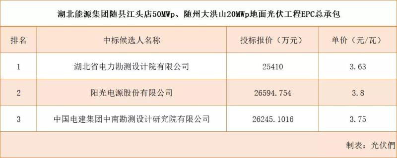湖北省電力勘測設(shè)計院有限公司以單價3.63元/瓦位列《湖北能源集團隨縣江頭店50MWp、隨州大洪山20MWp地面光伏工程EPC總承包》第一中標(biāo)候選人、詳情如下: