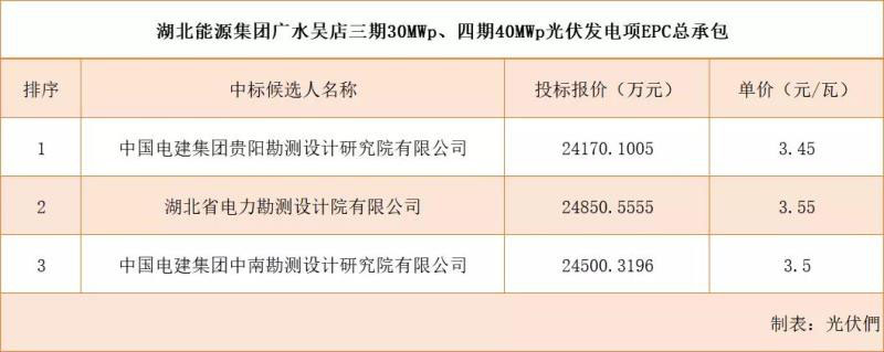 中國電建集團貴陽勘測設(shè)計研究院有限公司以單價3.45元/瓦位列《湖北能源集團廣水吳店三期30MWp、四期40MWp光伏發(fā)電項EPC總承包》第一中標(biāo)候選人,詳情如下: