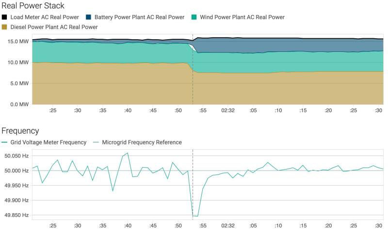 例如,在一個風(fēng)力發(fā)電設(shè)施和儲能系統(tǒng)配套運(yùn)行的示例中,五個正在運(yùn)行的風(fēng)力發(fā)電機(jī)的一個突然出現(xiàn)故障,并斷開了與電網(wǎng)的連接。這導(dǎo)致電網(wǎng)頻率急劇下降和電壓下降,其原因是其他正在運(yùn)行的發(fā)動機(jī)和電池的負(fù)載應(yīng)變突然增加。由于逆變器的快速響應(yīng),儲能系統(tǒng)在這個風(fēng)力發(fā)電機(jī)停機(jī)后立即增加了2.4MW的功率輸出,以彌補(bǔ)損失的發(fā)電量。來自電池儲能系統(tǒng)的快速功率注入還使電網(wǎng)快速穩(wěn)定和恢復(fù)頻率和電壓。因此,儲能系統(tǒng)在穩(wěn)定電網(wǎng)運(yùn)營中起到了至關(guān)重要的作用。