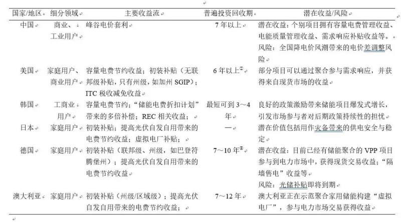 表1 主要國(guó)家分布式儲(chǔ)能的收益流